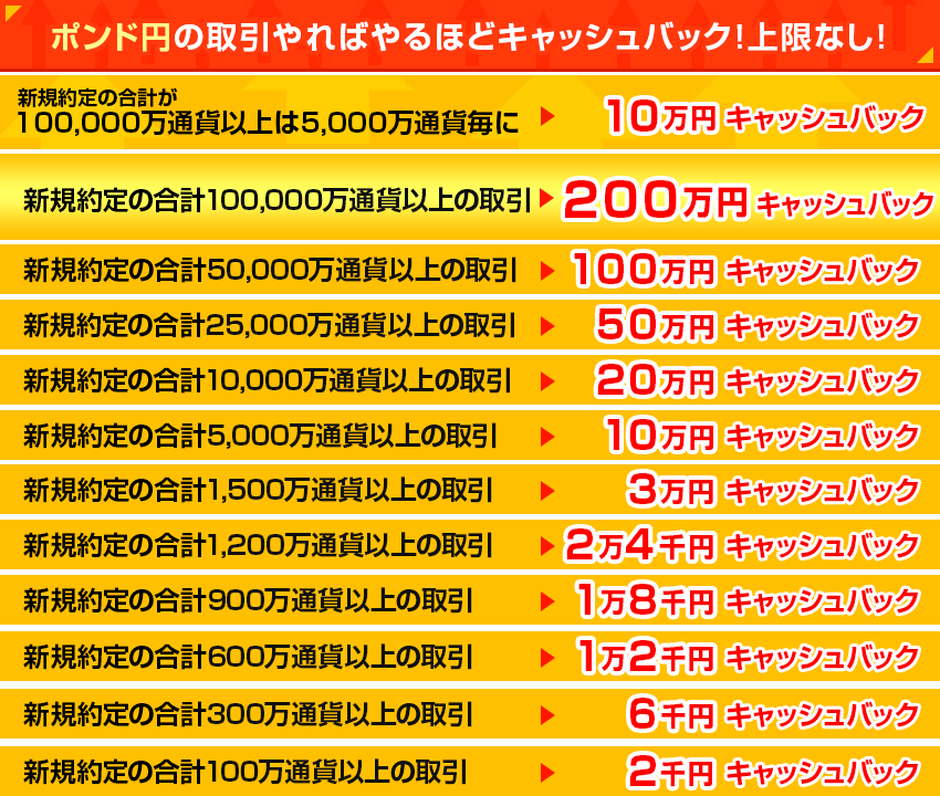 (例)ポンド円105,000万通貨の新規約定の場合、キャッシュバック額は2,100,000円(2,000,000円+100,000円)となります。