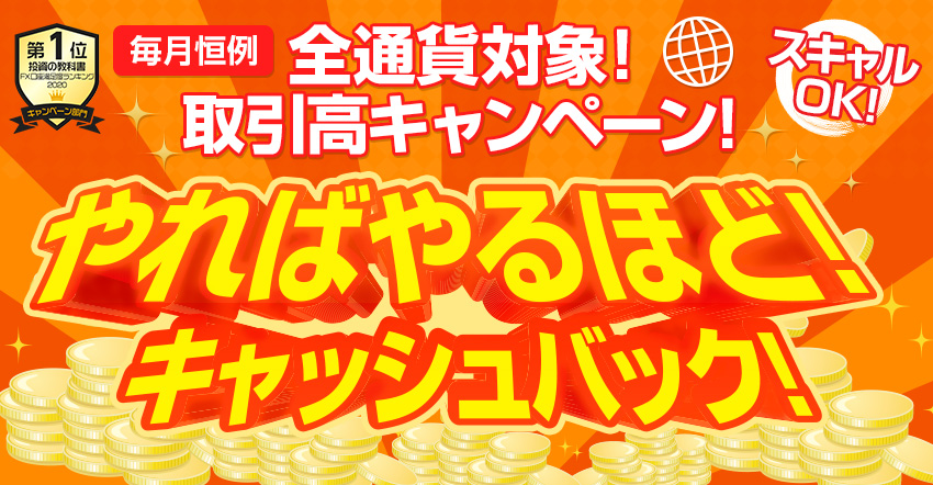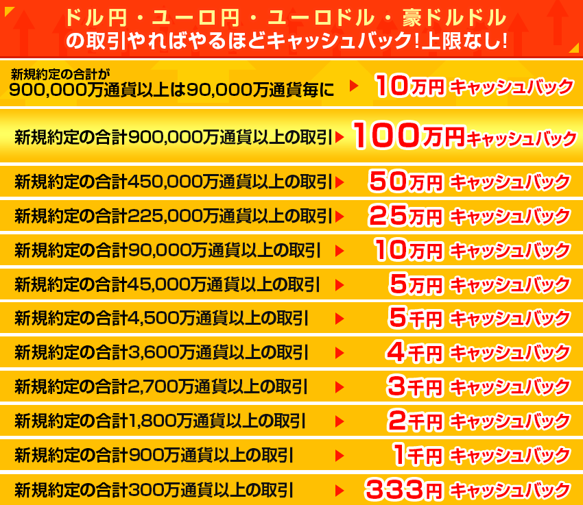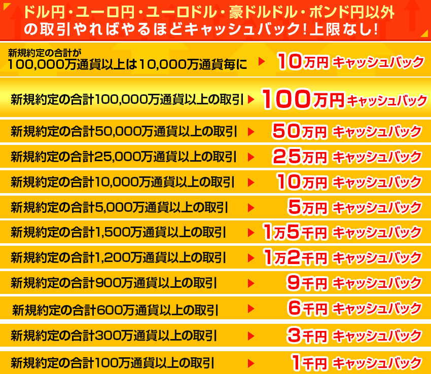 100,000万通貨以上は、5,000万通貨毎に100,000円キャッシュバック |