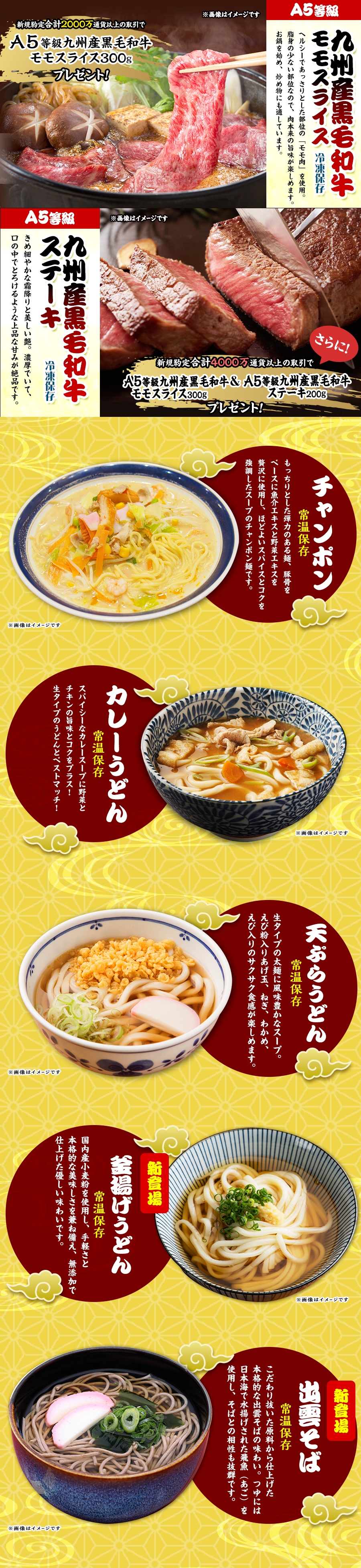 - ・本キャンペーン商品のA5等級九州産黒毛和牛モモスライス、A5等級九州産黒毛和牛ステーキは冷凍保存となっております。JFX厳選麺グルメは常温で保存していただけます。A5等級九州産黒毛和牛モモスライス、A5等級九州産黒毛和牛ステーキは、別送でのお届けとなります。