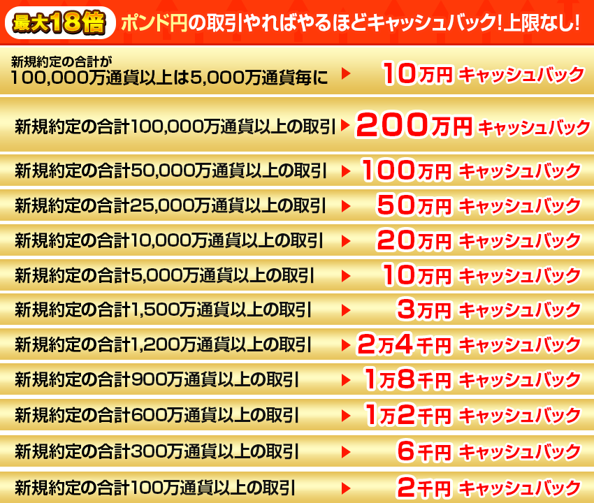 (例)ポンド円105,000万通貨の新規約定の場合、キャッシュバック額は2,100,000円(2,000,000円+100,000円)となります。