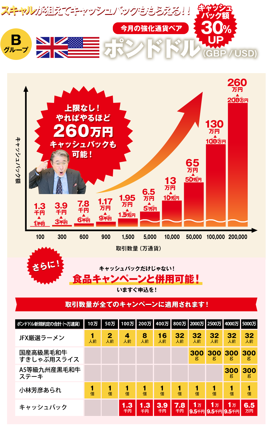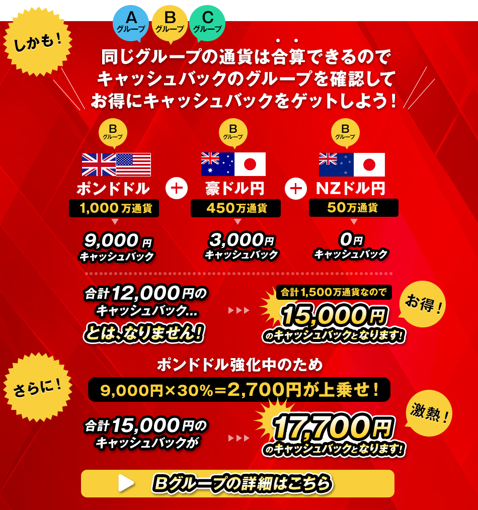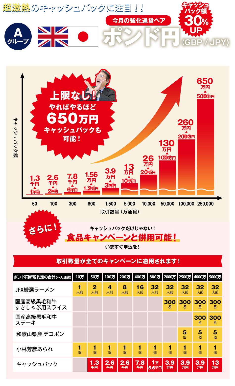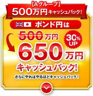 | 新規約定の合計 | キャッシュバック額 | 【強化中】 ポンド円 |