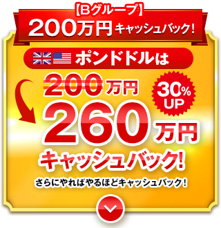 ※100,000万通貨以上は、10,000万通貨毎に100,000円キャッシュバック