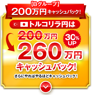 | 新規約定の合計 | キャッシュバック額 | 【強化中】 ポンドドル・トルコリラ円 |