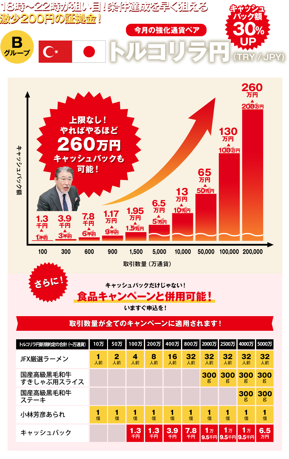 ※【強化中】ポンドドル・トルコリラ円分の100,000万通貨以上は、10,000万通貨毎に130,000円キャッシュバック